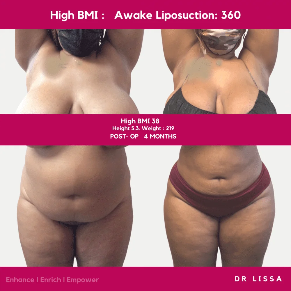 Today awake liposuction as a staged procedure or alone can give high BMI clients great shapely results without the risk of general anesthesia or the long down time. Awake Liposuction allows the client to move during their pain-free surgery and this positioning allows Dr. Lissa to sculpt an hourglass figure at the very least. However, the true result of large-volume awake liposuction can always be determined preoperatively by Dr. Lissa. How she does this we do not know but her artistic eye is able to create a realistic plan which has pleased thousands of clients and produced fabulous results. For more Before and After Photos visit our IG page @ DrLissa_theBodySnatcher. With a clean bill of health and a consult, Dr. Lissa has treated clients with BMI’s as high as 47 with awake liposuction. and her proprietary novcaine-like tumescent solution. Book a Complimentary Virtual Consultation today!